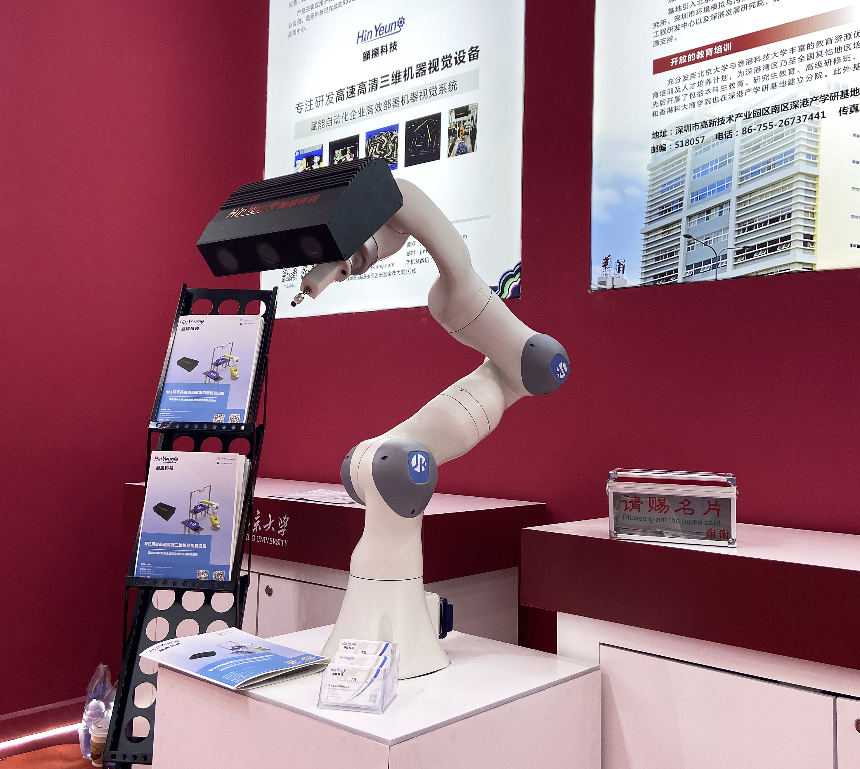 此屆高交會,顯揚科技聯合敬科機器人,以及北京大學聯合展出展品-《超高速三維機器視覺檢測系統》。此系統由顯揚科技與敬科機器人聯合開發,其中顯揚科技負責研發高速高清三維機器視覺設備、三維數據分析系統,敬科機器人負責研發協作機械臂,以及機械臂智能控制算法。