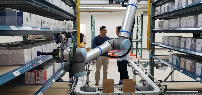 優傲機器人本身具有的簡易快速編程,豐富的網絡接口,人性化的操作界面,雙機相互通信協同等特性,為實現雙機協作帶來了可能。優傲憑借超強的協同工作性,為生產效益改進帶來貢獻。