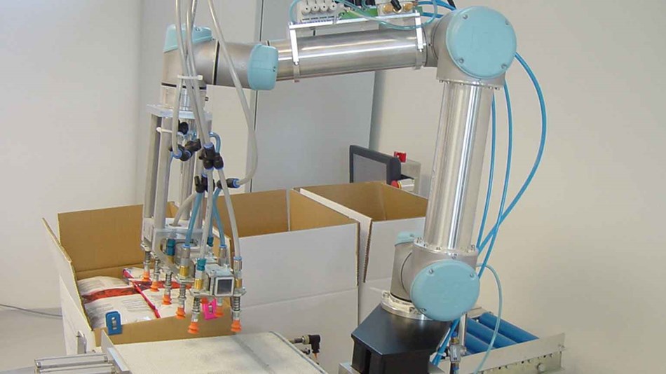 優傲機器人安置在充填封口機的傳送帶前面,以拾取掉落到傳送帶上剛袋裝的產品。為了實現持續的工藝流程,還開發了抓取工具,工具上裝有五組雙吸盤部件。這十分適合提起表面光滑且柔軟的袋子。