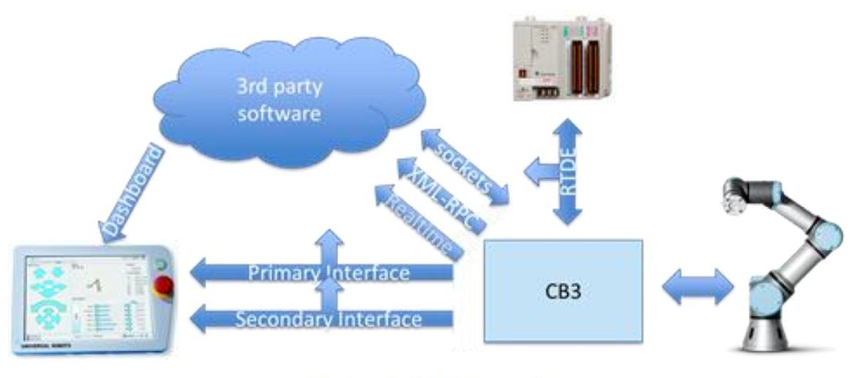 UR機械臂提供豐富的通訊端口,用來和上位機進行通訊。通過不同的端口可以實現不同的控制功能,從而實現上位機控制。
