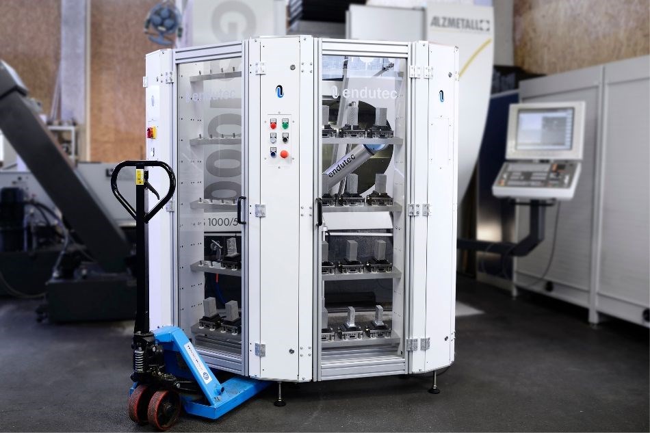 由于某些零件較為鋒利,所以仍然設(shè)置了圍欄。盡管需要安全保護(hù),但裝載站節(jié)省空間且靈活。如有必要,可以使用叉車輕松移動(dòng),并且在設(shè)置安全措施后,可以裝載另一臺(tái)CNC機(jī)床。UR協(xié)作機(jī)器人由于易于編程和處理而特別有說服力。而e系列優(yōu)傲協(xié)作機(jī)器人型號(hào)具有集成的力 - 扭矩傳感器,可以將工件精確插入芯片夾具中。