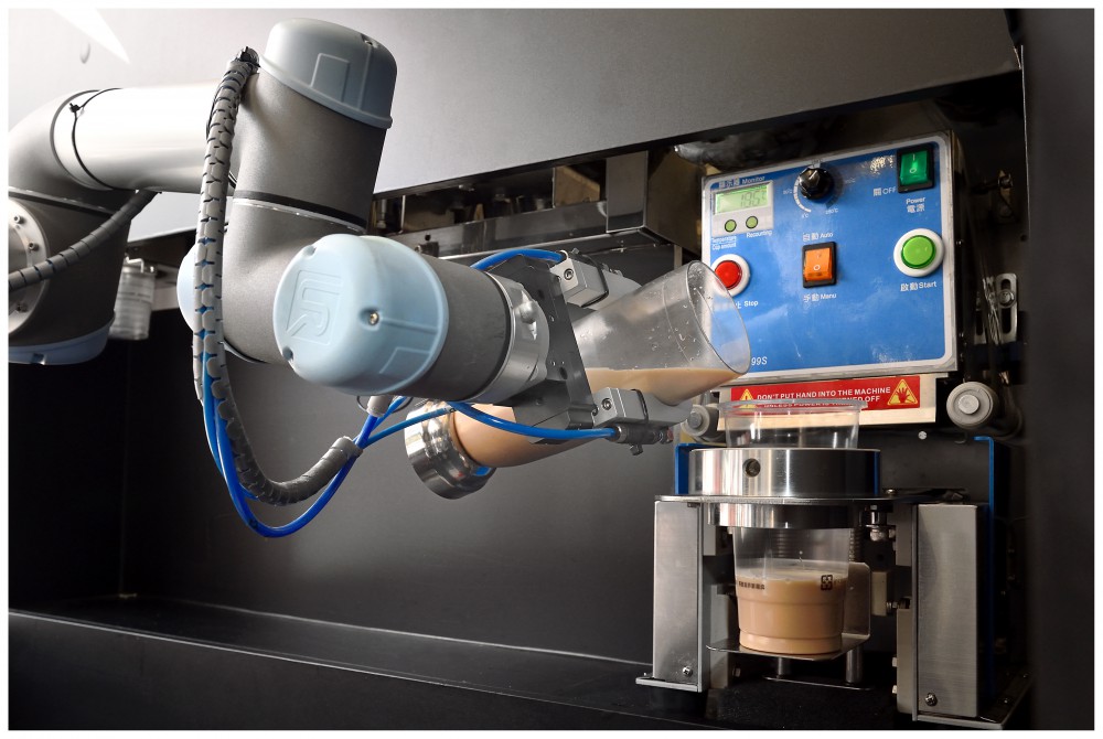 Babo Arms手工珍珠奶茶鋪在飲品調制流程導入UR5協作型機器人,協助進行制茶、清洗杯子、飲品封膜、交付客戶的全部流程。UR5協作型機器人設置快速便捷,可靈活部署在固定店面或臨時室外空間,非常適合臺灣餐飲服務業的運營模式——喜愛配合節慶日設立快閃店。此外,UR協作型機器人編程簡單,能與人毫無隔閡地進行協作,“人機協作”產品的特性使得Babo Arms可以依據現場服務狀況對流程進行優化,打造飲品專用的自動化生產線。在工作中,機器人負責完成重復性高的任務,員工則專注于新產品研發與提升客戶服務質量等更有價值的業務上,機器人與人類各展所長相互合作,從而實現1+1>2 的效益。