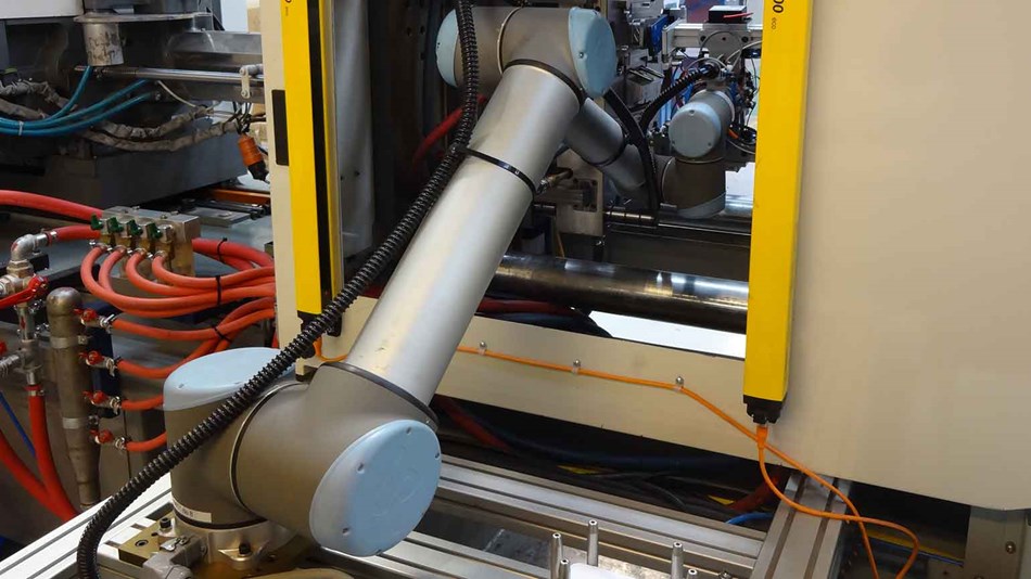 T公司決定試用兩臺六軸 UR10 機器人,將其編程用于模內建模、傳遞模塑和共注成型任務。