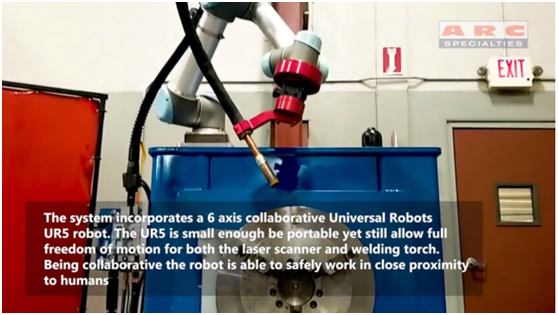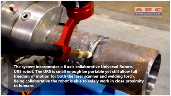 人工智能管道焊接系統(AIPW)采用了優傲機器人的的6軸UR5協作機器人手臂來完成具有挑戰性的焊接。 “UR5協作機器人現在成為了我們的'金臂',”Allford說。 “UR5協作機器人足夠小,便于移動,但仍然可以為激光掃描儀和焊槍提供完全的運動自由度。協作機器人能夠安全地在人類附近工作。”